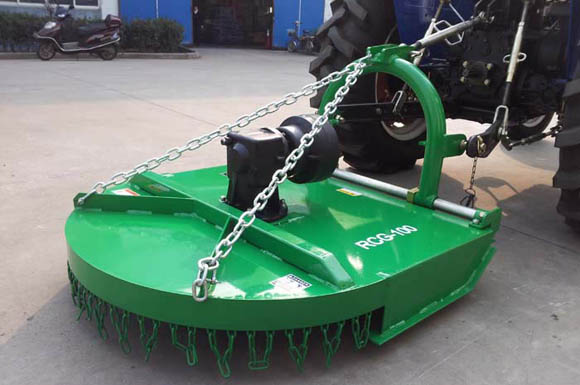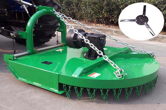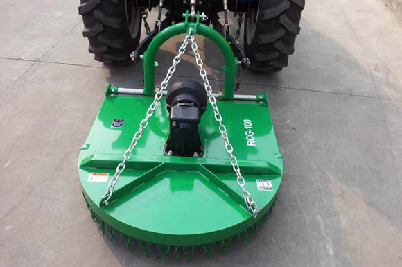When you need a mower that is great for cutting and clearing grass, weeds and even brush up to 1 1/2” in diameter the FH-RGC mower is a great option. You can adjust the offset by sliding the 3-pt mount left or right. This allows you to get closer to and/or under objects and trees. The offset is up to 6” left or right of center. This mower is for tractors 15 – 30 horsepower. It has a round back for close quarter cutting. The heat treated alloy steel blades swing back when they hit something solid that they cannot cut. Breakaway blades and shear bolt protection are also part of the safety features of this mower. T Safety chains are installed to reduce the danger of objects being thrown by the cutting blades. A free flex top link connection provides for easy hook-up. This permits the deck to follow the terrain for an even cut. Free flex, floating design with skids allows mower to adjust to and follow contour of your ground providing an even cut.
