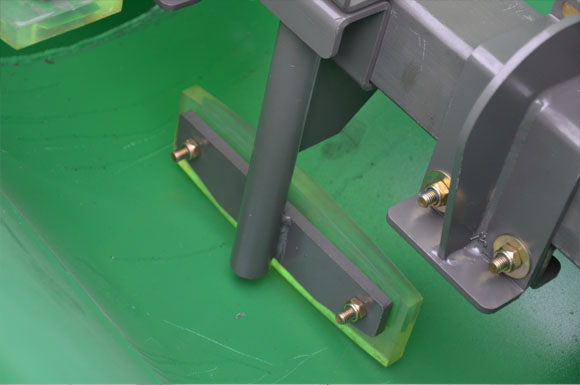 This new design utilizes a revolving paddle mixing action, a method far superior to augers when it comes to producing well-mixed concrete. The revolving paddles are driven by a strong hydraulic motor through a dependable chain and sprocket drive. The hydraulic motor is powered by the auxiliary hydraulics of the skid-steer. The new chain and sprocket drive takes the shock-load off the hydraulic motor when mixing paddles are reversed. This protects the hydraulic motor and greatly extends motor life. Paddle shaft is carried by heavy-duty roller bearings with convenient grease zerks for easy maintenance. Replaceable neoprene pads protect the paddles and are adjustable and reversible for longer life. “Abrasion Resistant Steel” prolongs life of drum.
